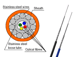 up to 4 Single or Multi Mode (SM or MM) optical fibres contained in a stainless steel loose tube, protected with stainless steel armouring wires